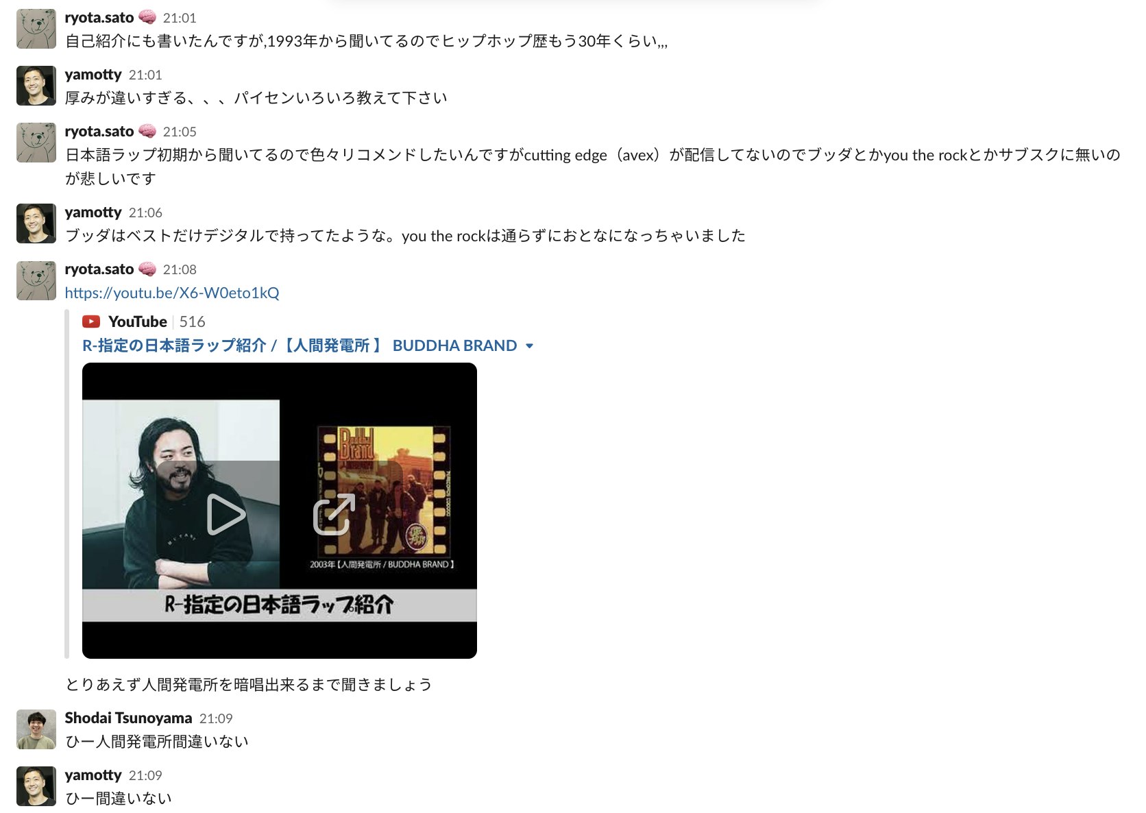 主に日本語ラップについて会話されている「#z-hiphop」もありました!音楽系では唯一のチャンネルですね。ブラックミュージック視聴歴約30年(!)の佐藤さんを中心に、日本語ラップの歴史や好きな曲についてコミュニケーションされています!