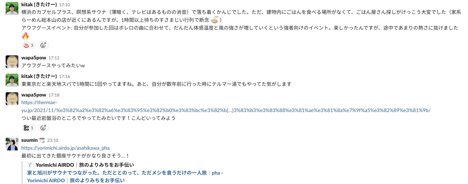 「#z-sauna」は部活チャンネルの投稿頻度がとても活発です!首都近郊だけではなく、全国のさまざまなエリアのサウナ情報が飛び交っていますね。主に情報交換をされてるチャンネルなのですが、今後サウナ部の活動にも期待が集まります。