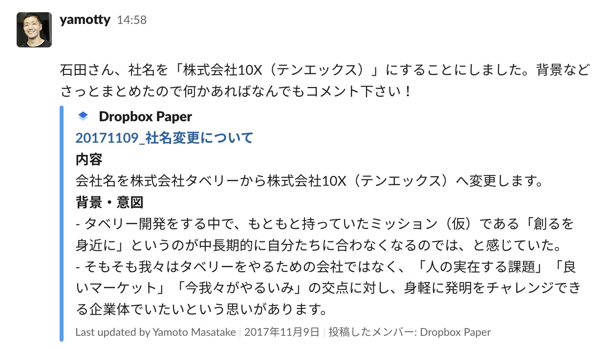 1人目の社員である石田さんに社名変更を伝えた際のメッセージ
