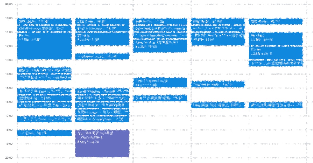10時くらいから働き始めます。これは先週 (7/25 - 7/29) のスケジュールです。比較的ミーティングの多い週でしたが、ミーティングは水曜日にあつめているためFocusする時間は取りやすいです。