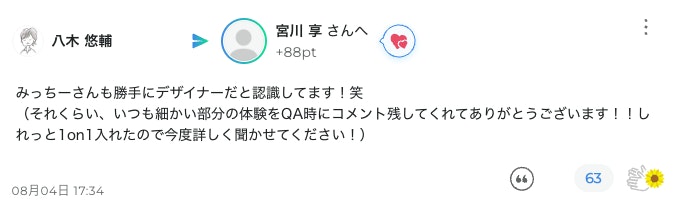 デザイナーのjさんから宮川さんへ送られた感謝のUnipos