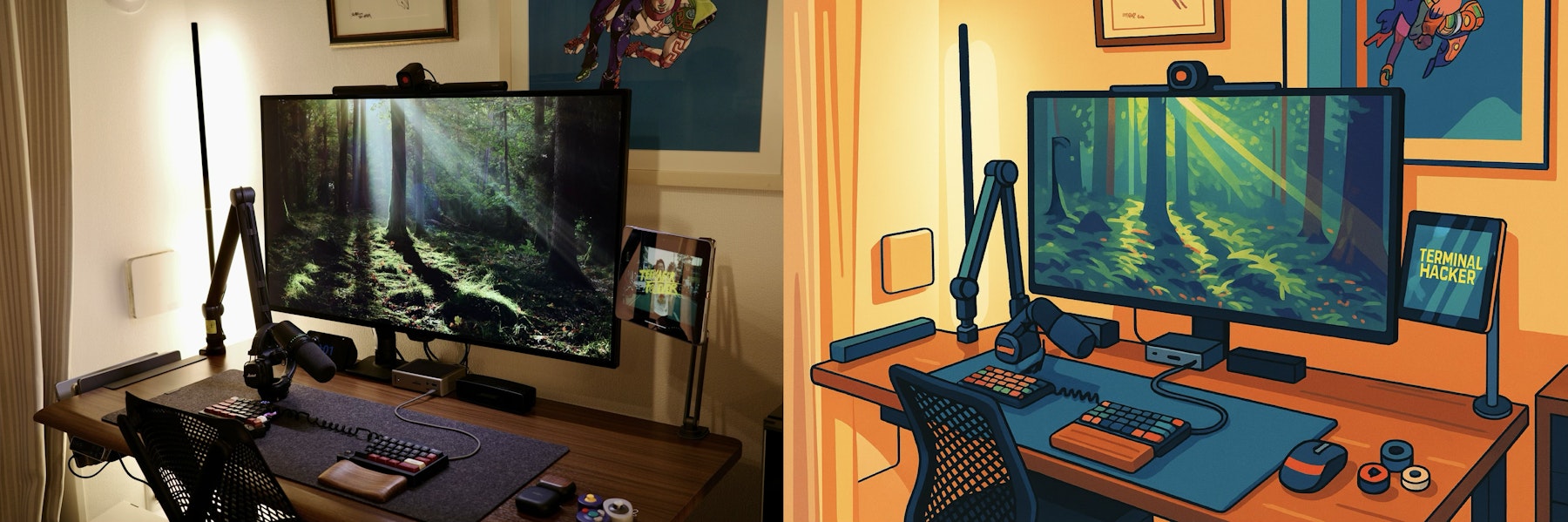 こだわりのデスク。生成AIによる画像生成で遊んだりしてます。