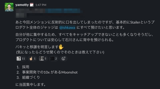 2020年9月、CEO矢本からSlack全社チャンネルへの投稿。バリューの1つ「背中を預ける」のリアクションが押されています。