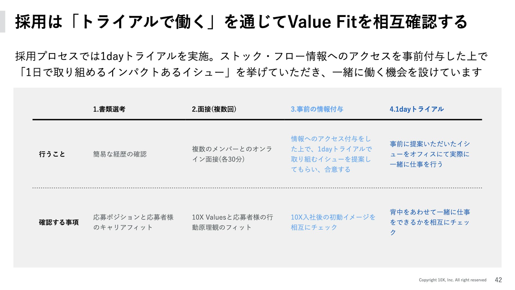 この質問は、10Xと候補者の方、お互いの価値観がフィットするかを把握するための質問として設定しています。