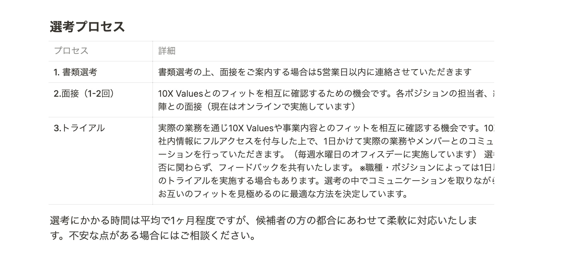 一定以上の時間を割いて頂くプロセスになりますが、トライアルを経ることで、カルチャー・スキルのフィットをお互い確認でき、選考を受けた方からは「納得感のあるプロセスだった」「学びの機会にもなった」いう感想をいただいています。