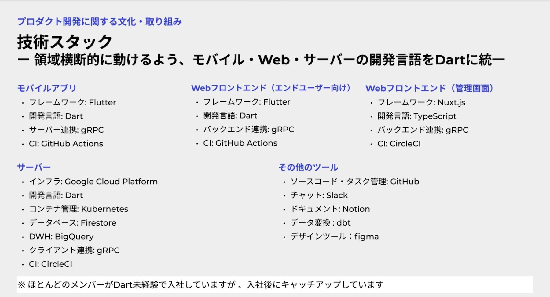 1人のエンジニアがクライアント・サーバー等領域を横断して機能を開発しやすい環境をつくるため、フルDart体制をとっていることが特徴です。技術選択の背景については下記のブログもご覧ください!