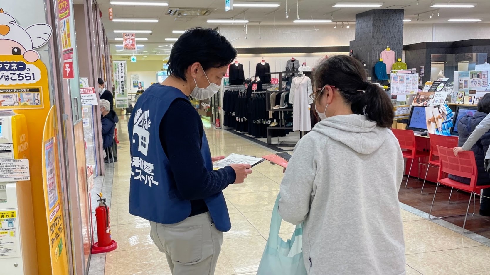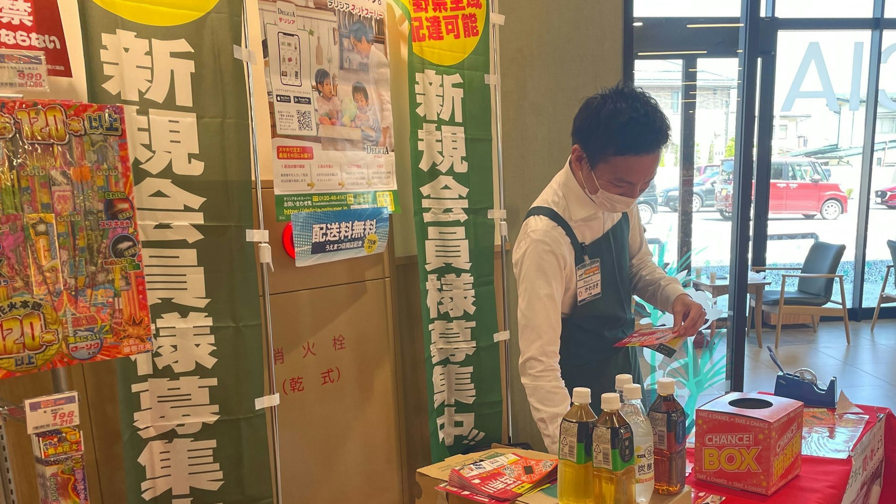 主に、新しくネットスーパーを立ち上げた店舗でチラシ配りを行っています。店舗のエスカレーター横にチラシ配りのスペースを作ったり、スーパーの入り口で福引券を配った上で帰りにブースに寄ってもらったり、といった施策を行っています。