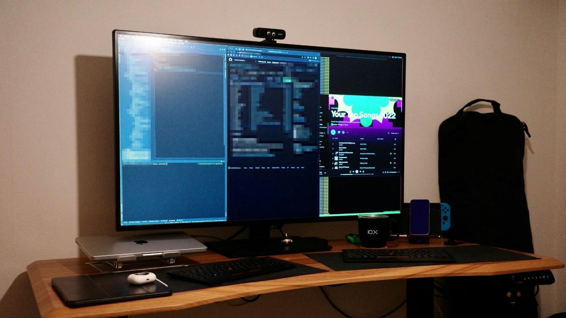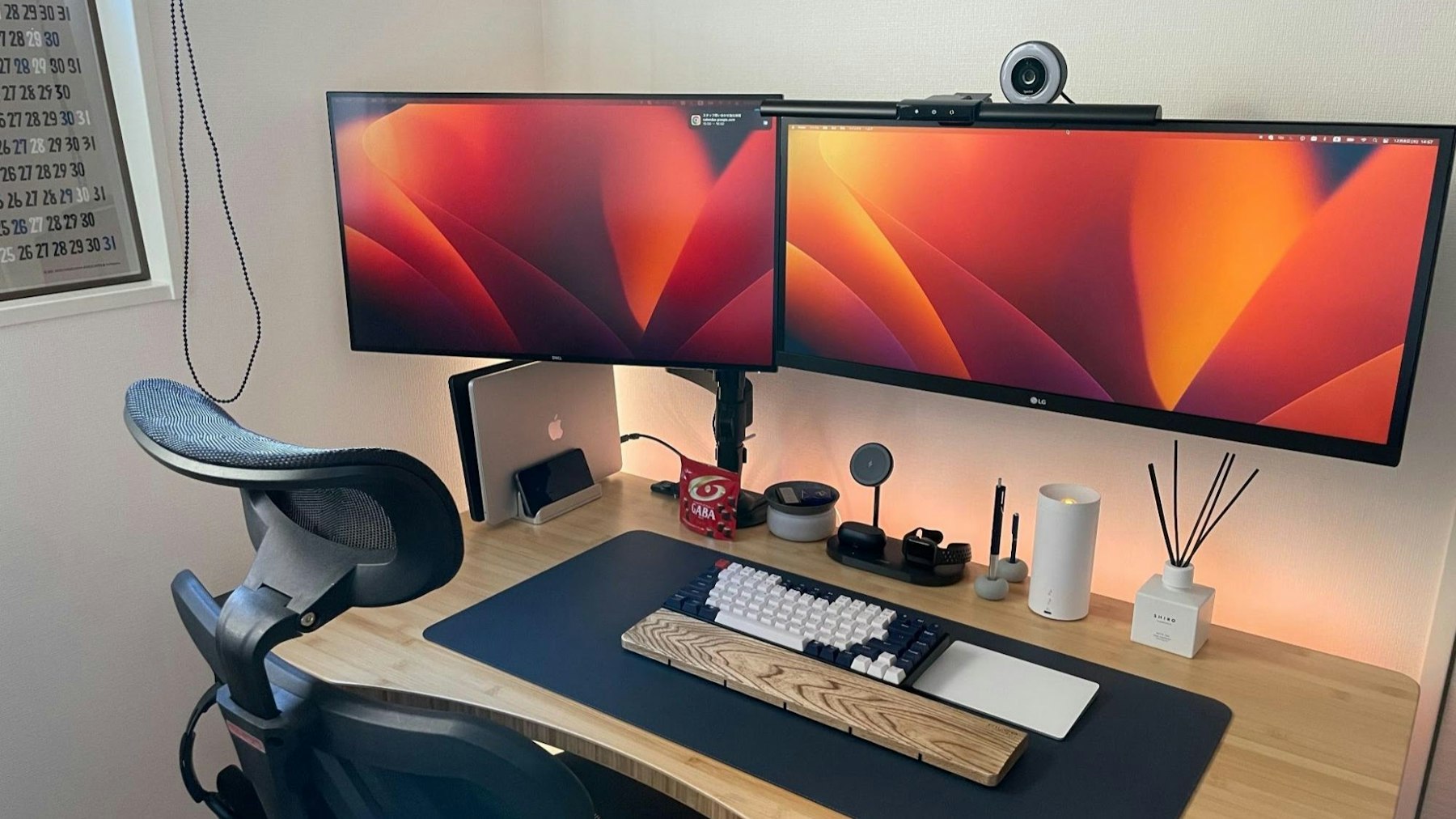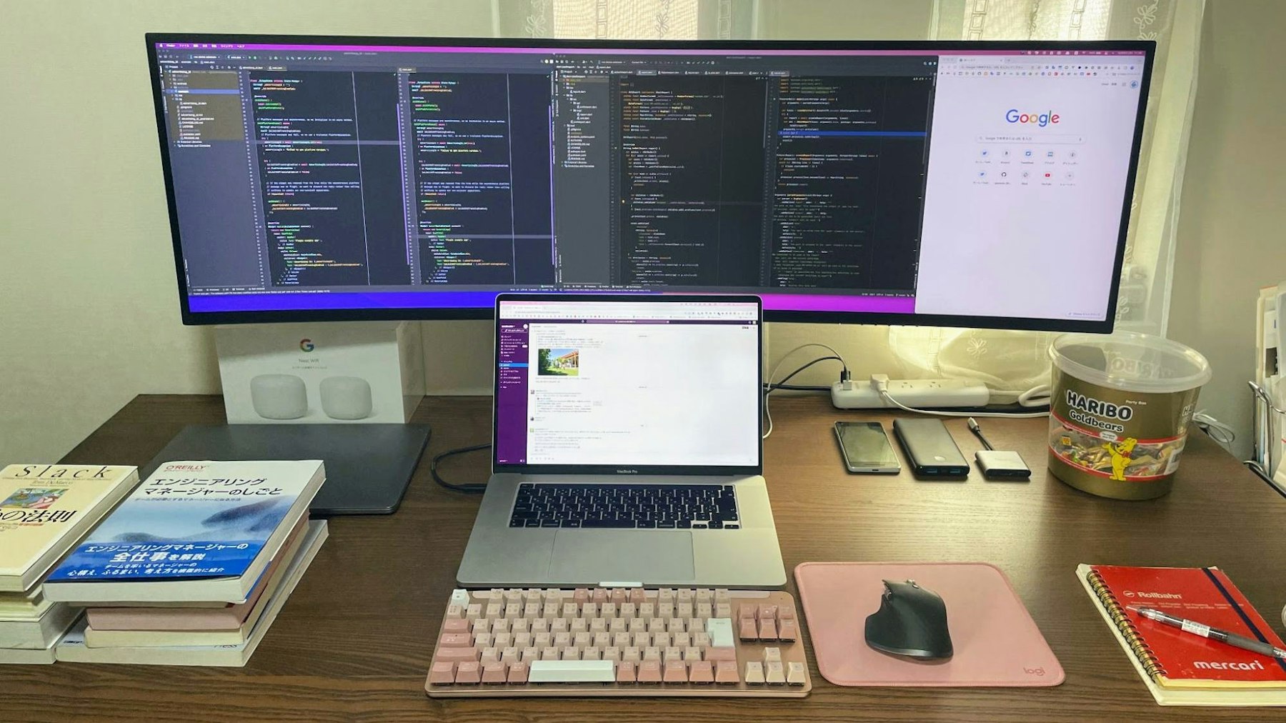 元々は小さいデスクでMacbookのみで仕事をしてたのですが、今年に入って幅・奥行き共に広いデスクを買って大きなディスプレイを設置しました!キーボードとマウスも導入しましたが、仕事の生産性が上がっているかどうかはわかりません!