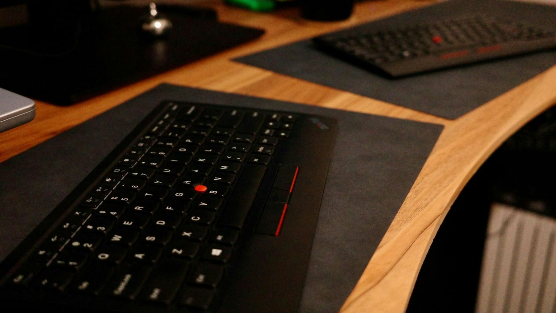 姿勢よくTrackPointを使うために右手用・左手用の2枚のキーボードを使っています。ディスプレイは43インチ一本勝負です。