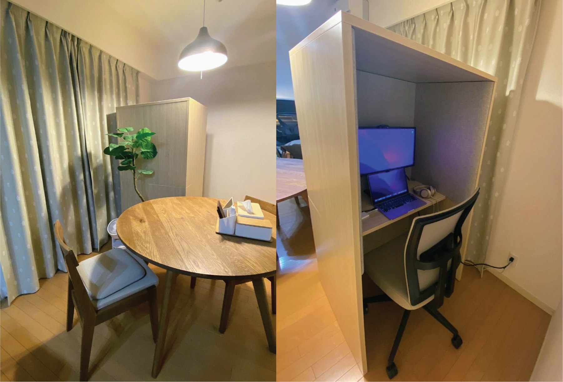夫婦共にフルリモートワークになったため、入社時の支援金で吸音素材付きのミーティングブースを導入しました。こちらはTRANQORD BOXデスクで、比較的お値段もリーズナブル(他のブースは10万円以上が相場)な上に、ライトブラウンでお部屋に馴染みやすいところが気に入っています!
