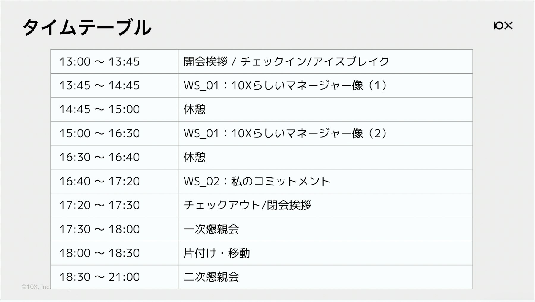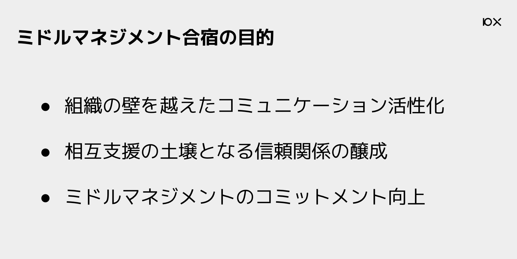 さて、少し前ではありますが3月10日の午後から半日丸々使って10X初のミドルマネジメント合宿を開催しました。