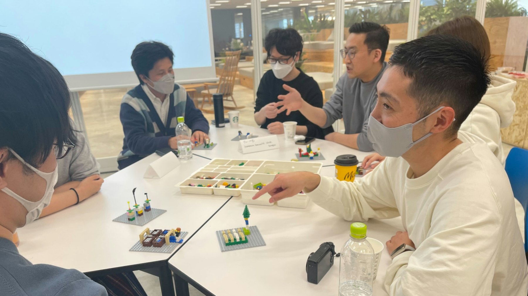 レゴシリアスプレイを活用したワークを実施。レゴシリアスプレイとは、存在はするが上手く表現できないコンテキストを言語化し、共有するためのワークです。組織の風土や文化、暗黙のルールなど、物理的には見えないものを言語化し、チームで共有することに適しており、今回のテーマにピッタリということで採用しました。