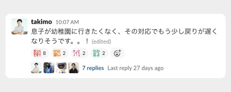 ー育児をしながら働く方も多い中、Slackで特徴的なコミュニケーションはありますか?