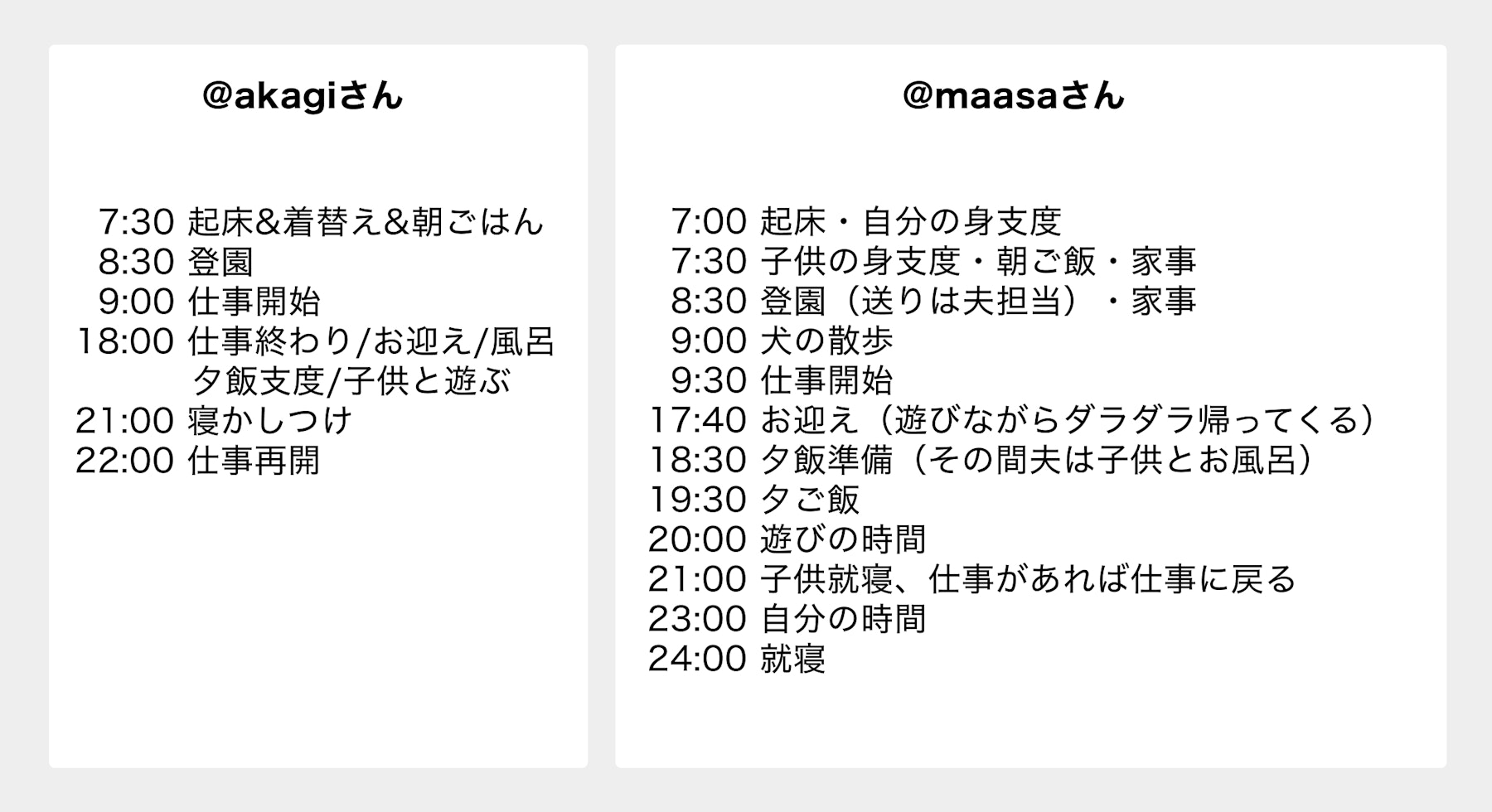 赤木:うちは妻もフルタイムで働いていて、2日ずつの当番制になっているんですが、当番の日は9時〜18時まで働いてその後はお迎えや食事、寝かしつけまで全てやります。火・金が僕の当番で、月・木は妻、水曜日はおばあちゃんが担当です。