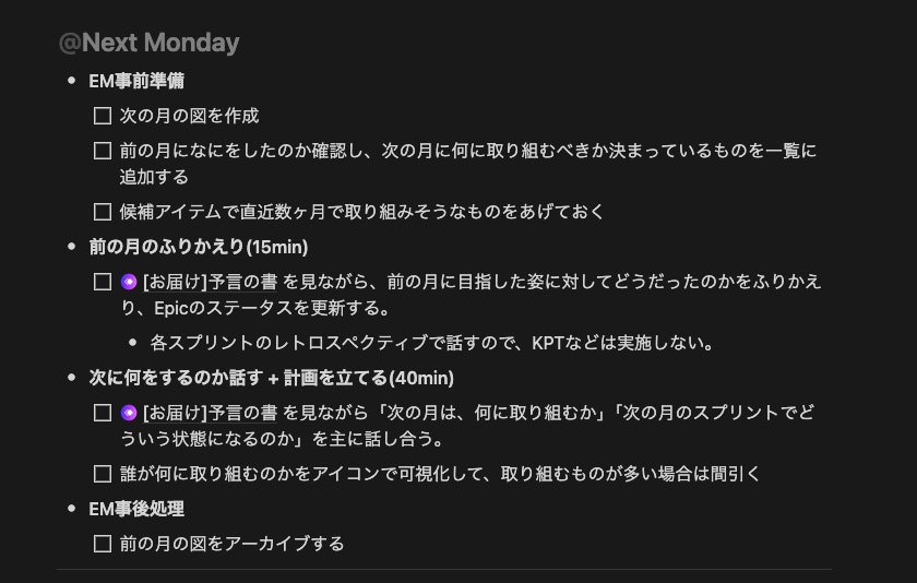久田:「次何する会」という月次のミーティングですかね。そこで、「予言の書」を作るんです。例えば、1月の「次何する会」では、「2月はこれをしよう」という予言の書を作ります。予言の書で宣言した内容は、2月のスプリントに落とし込んで、具体的な実施項目を決めていきます。この計画があることで、1ヶ月先のチームの状態が見えてくる。その結果、ゴールに向かってブレずに進められている、という実感を持ちながら開発に取り組めるんです。