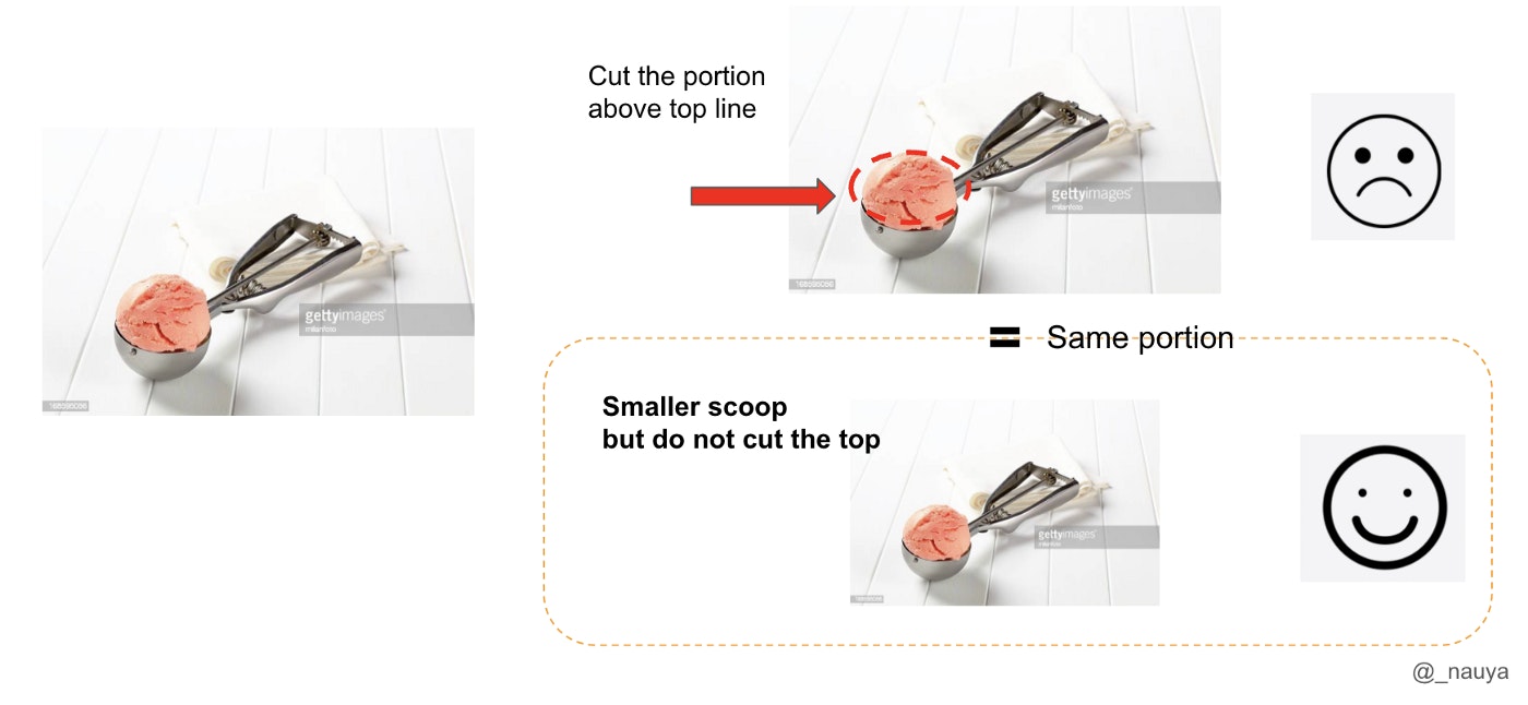 スプレッドシートを前にしたときは、私は、お客さまを目の前にしたときにスクープの上部をカットすることが、サーバーにとってどのような精神的意味を持つのかに気づいていませんでした。レストラン業界で働く人は、自然と、人にサービスをすること、良いサービスを提供することが好きな人がほとんどです。スクープの上部を切って、マグロやサーモンを標準的な分量にすると、ケチに見えるし、文句を言うお客様もいらっしゃいます。スクープの上部をカットすることでポーションをコントロールするのは理にかなっていますが、それでは店の人に精神的なプレッシャーを与えてしまう。そこで、マグロやサーモンをいくら載せても標準を超えないように、スクープを小さくして、最終的に私たちの望む利益率を確保できるようにしました。