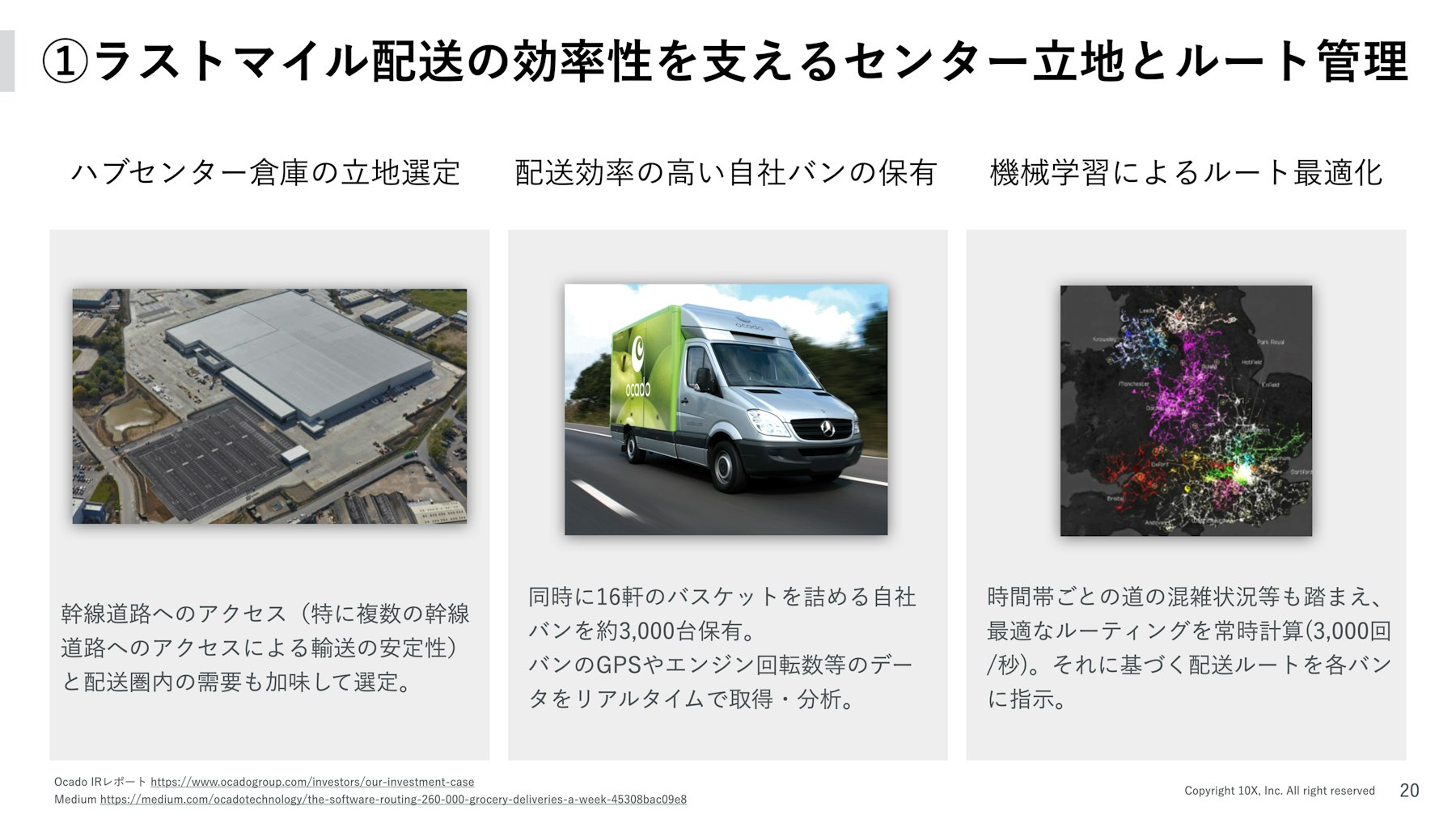 - Ocado成長の鍵は「ピッキングの効率性追求によるSKU数の充実」、「ラストマイル配送効率化による便利な配送の提供」、「需給予測の精度向上による低欠品率・低廃棄率の実現」の3つのオペレーション戦略