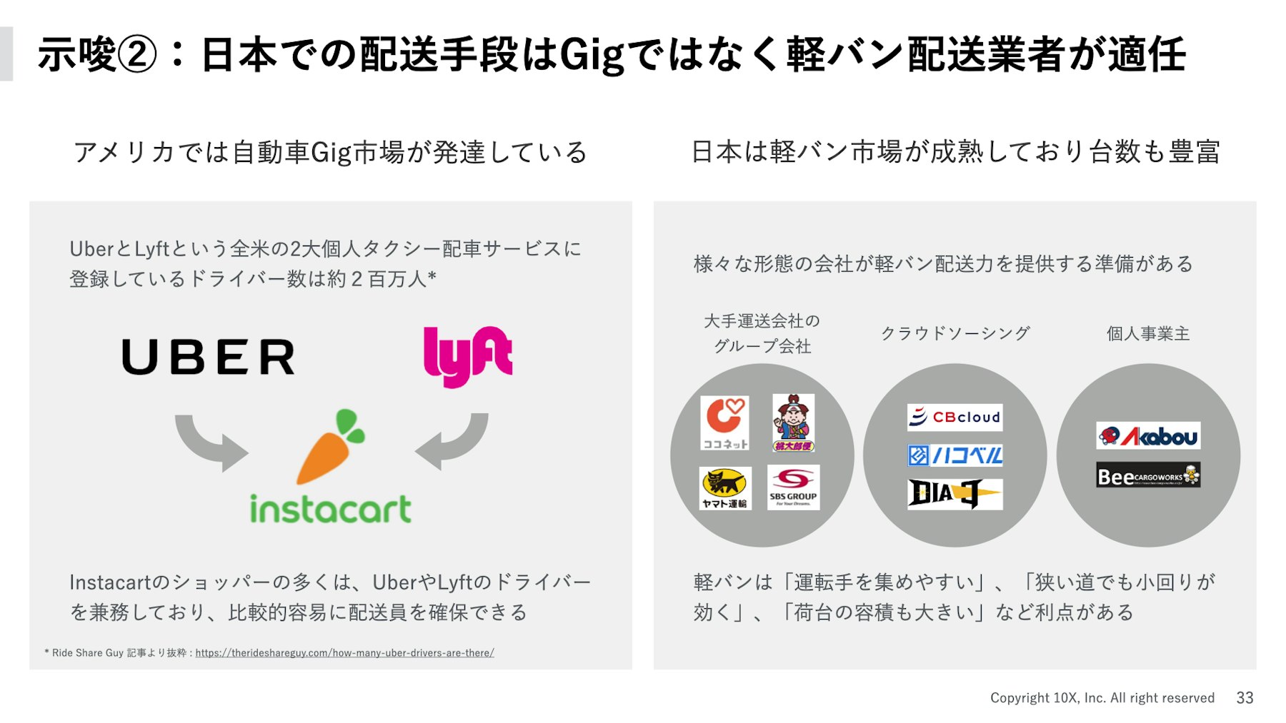- 米国と異なりギグワーカーの少ない日本では、軽バン配送業者が配送能力を提供可能