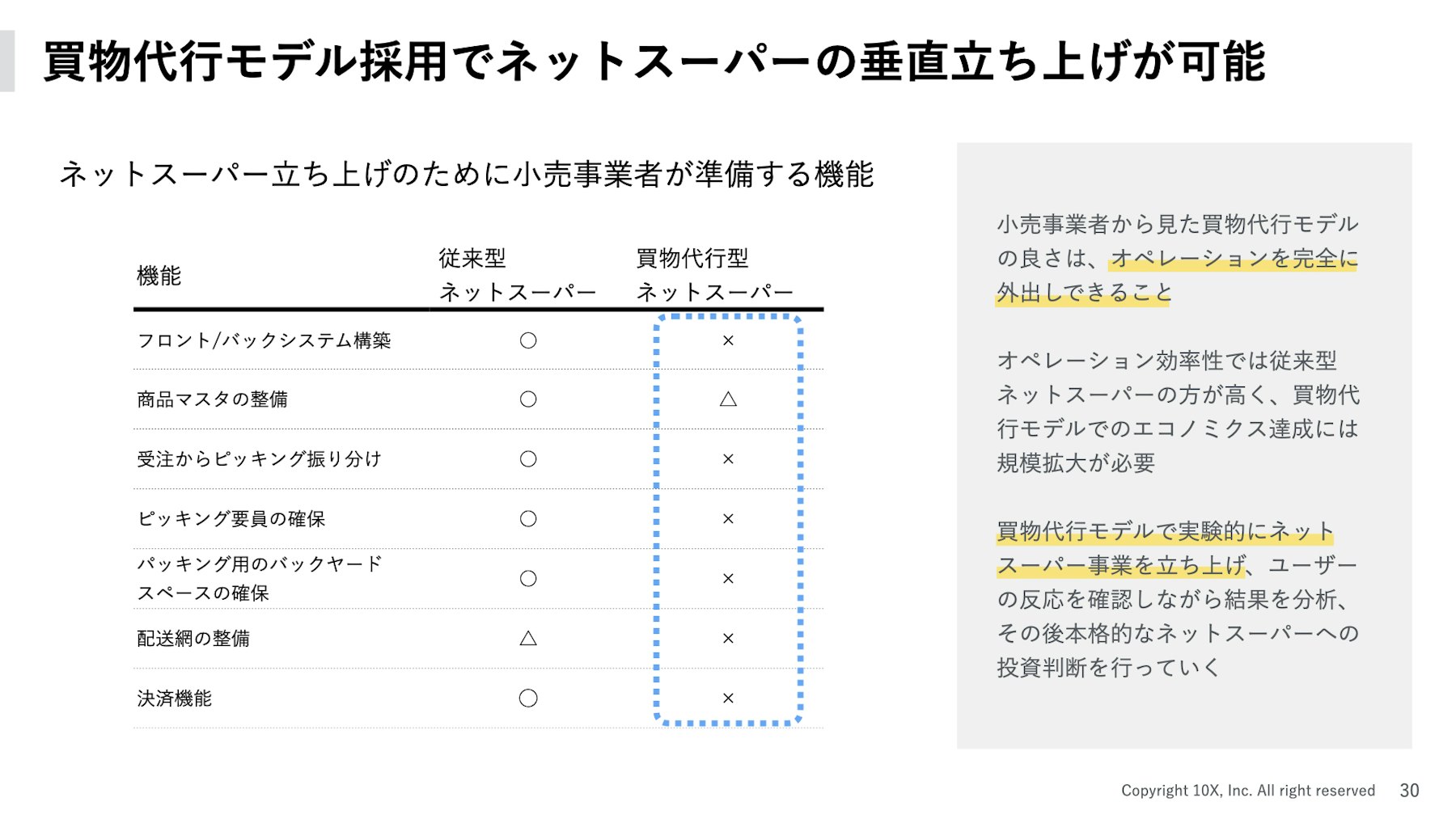 - ネットスーパー導入率の低い日本では、買物代行モデルの採用でオペレーションを外出しすることで、実験的にネットスーパー立上げが可能